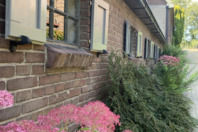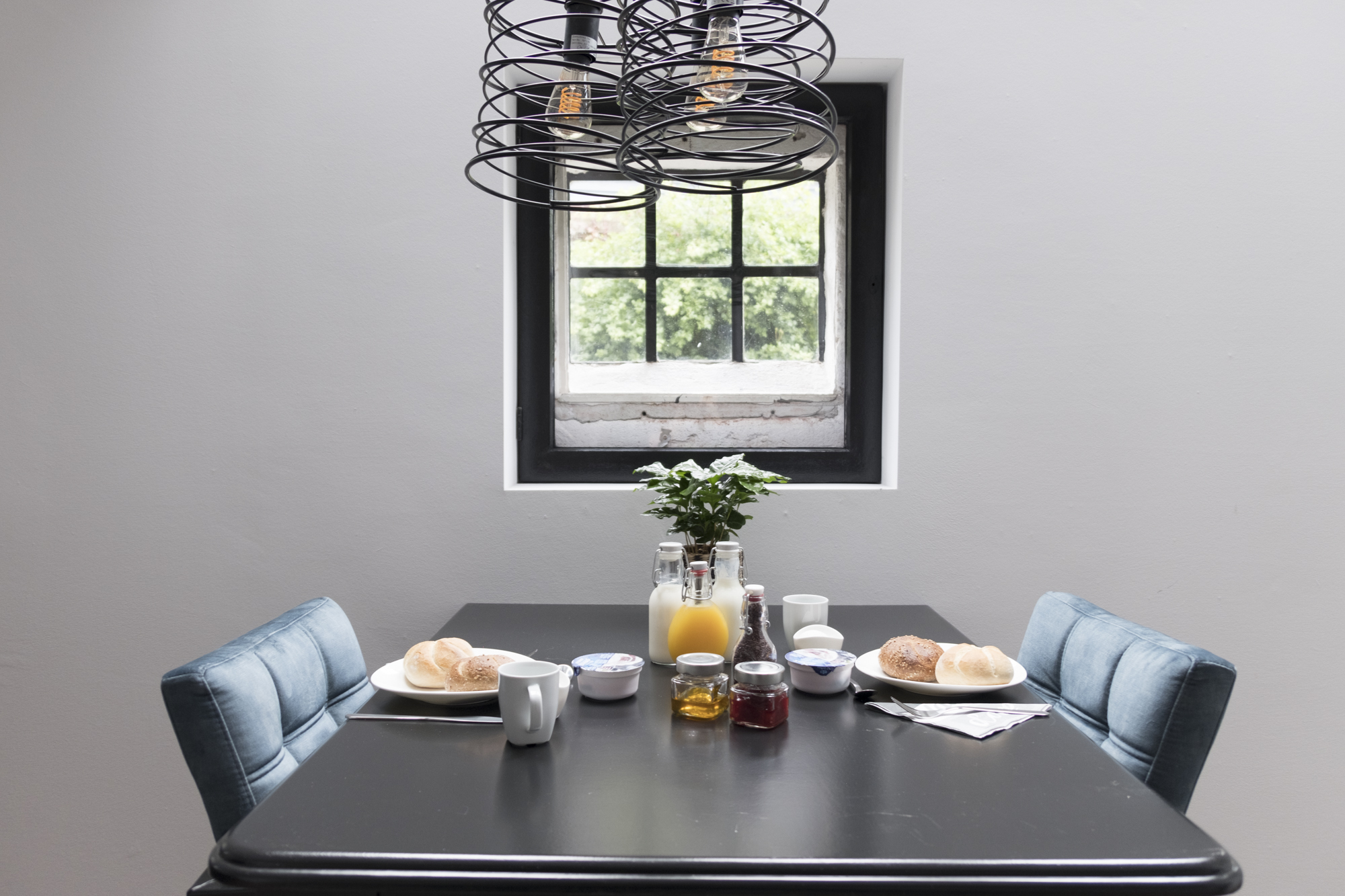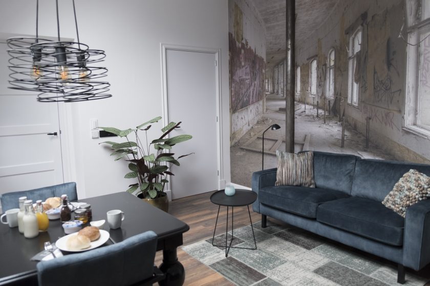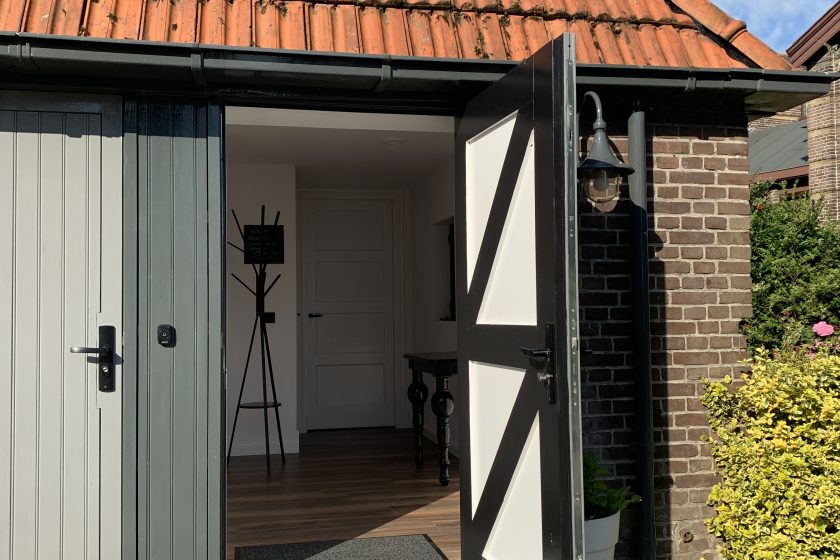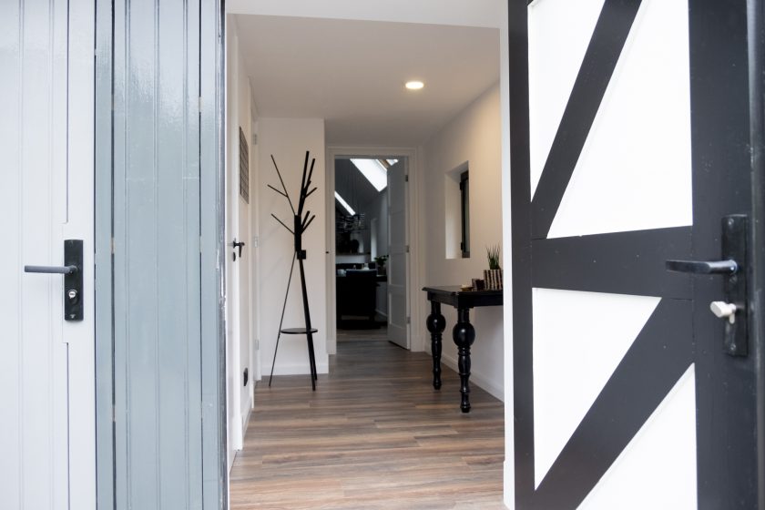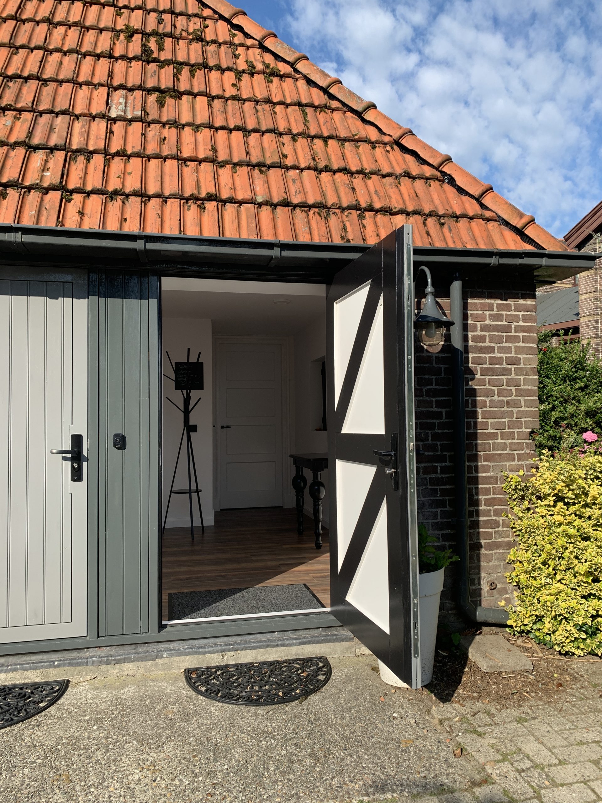 Studio-appartement Buurman is een stoere ruimte met zwarte details. Je komt binnen door een privé-voordeur en stapt dan in een ruime hal, waar je de muur mag gebruiken als gastenboek. Aan de rechterkant zijn de oorspronkelijke stalramen in ere gebleven. Hiervoor zijn kozijnen met dubbelglas aangebracht om de kou buiten te houden, maar de mooie oude details zijn nog zichtbaar. Hier bevindt zich ook het toilet.