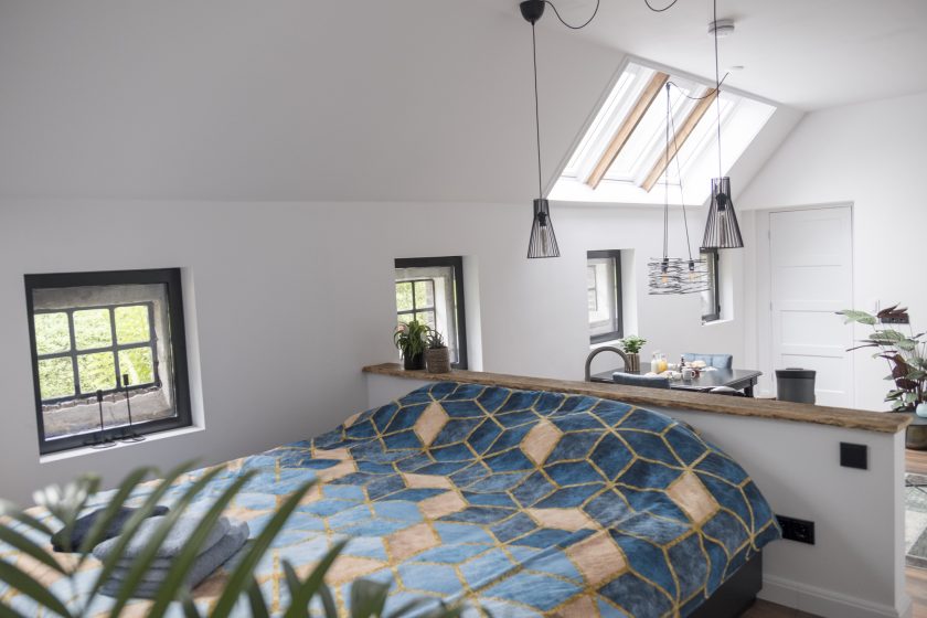 De ruimte bevat vier dakramen die met rolgordijnen zijn te verduisteren en voor de stalramen zijn aan de buitenkant luiken geplaatst om het licht buiten te sluiten, als je dat wilt.